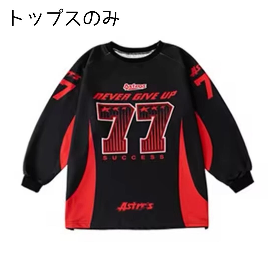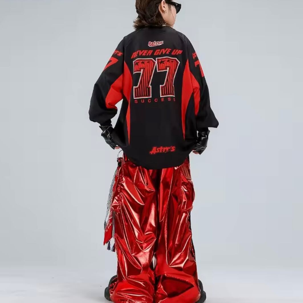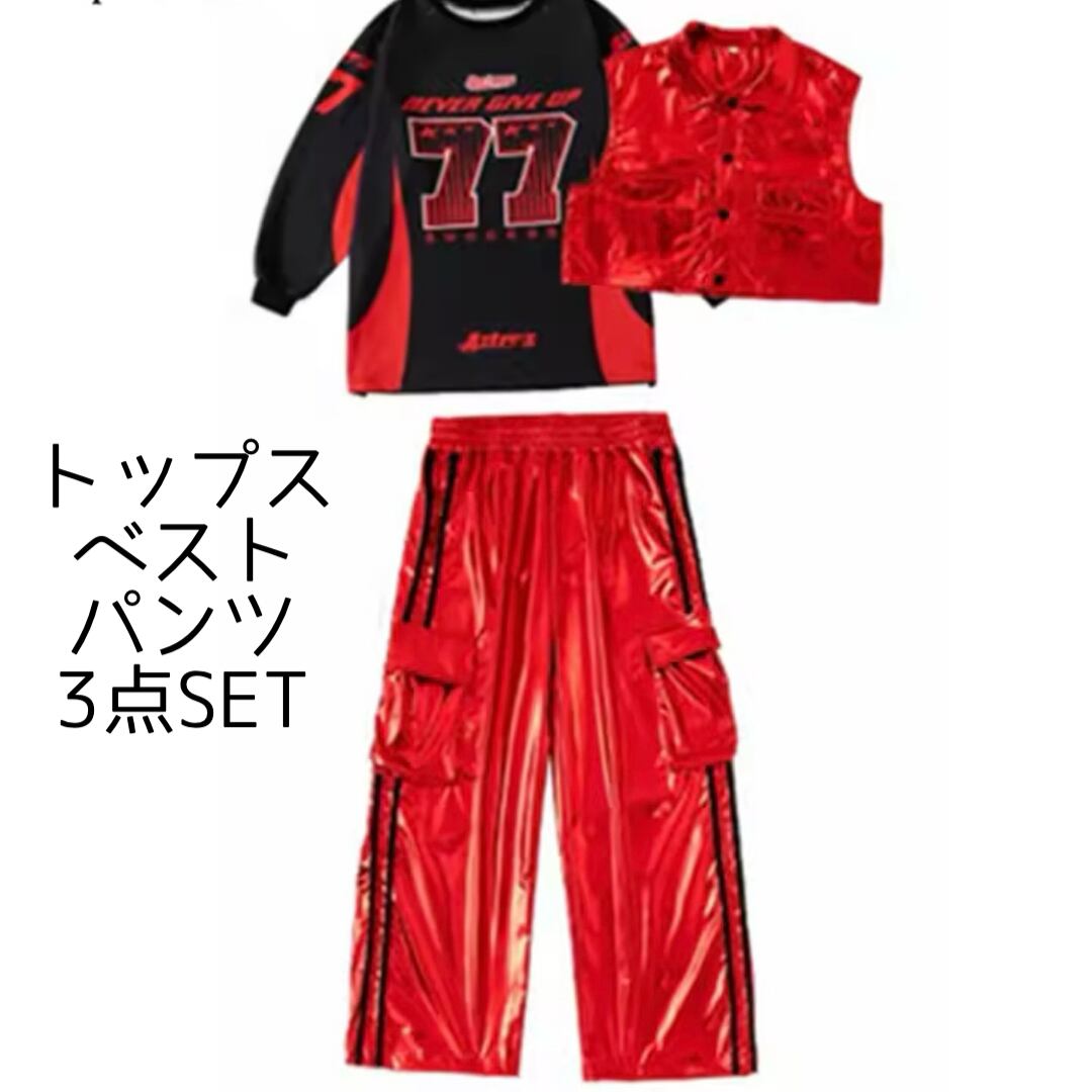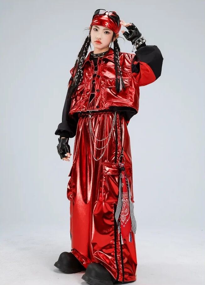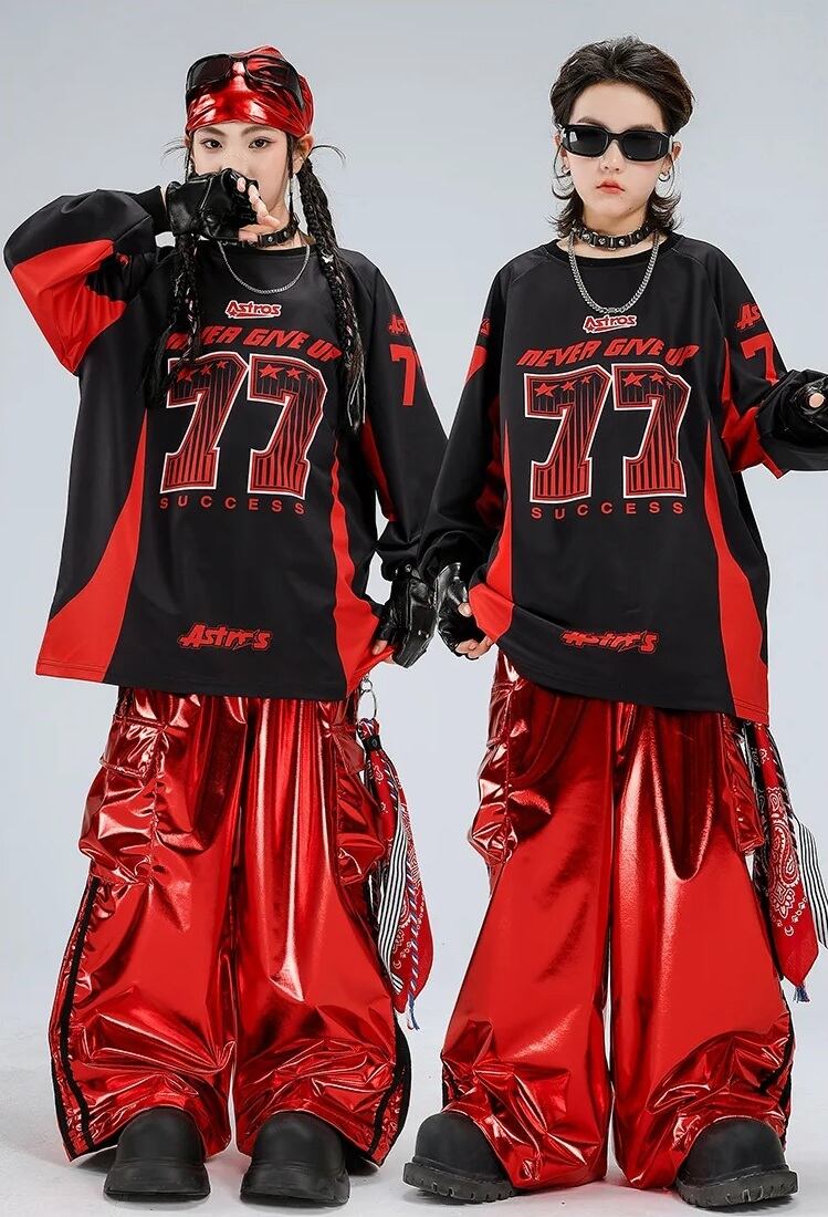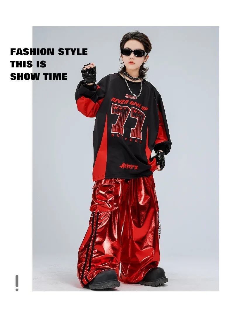 キッズ ダンス衣装 メタリック 赤 ゲームシャツ 韓国 ストリート K-POP セットアップ ヒップホップ カーゴパンツ ライン ユニフォーム ロンT 長袖 2点セット 派手 女の子 男の子 発表会 KD-2