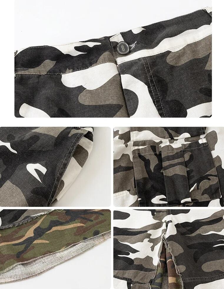 鮮やかなブルーのストライプシャツと、ハードな迷彩パンツの組み合わせは、スポーティーな躍動感とストリートの力強さを同時に表現します。