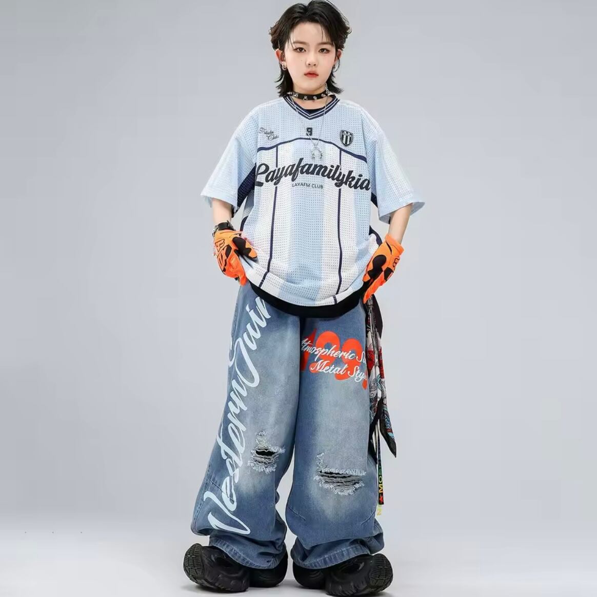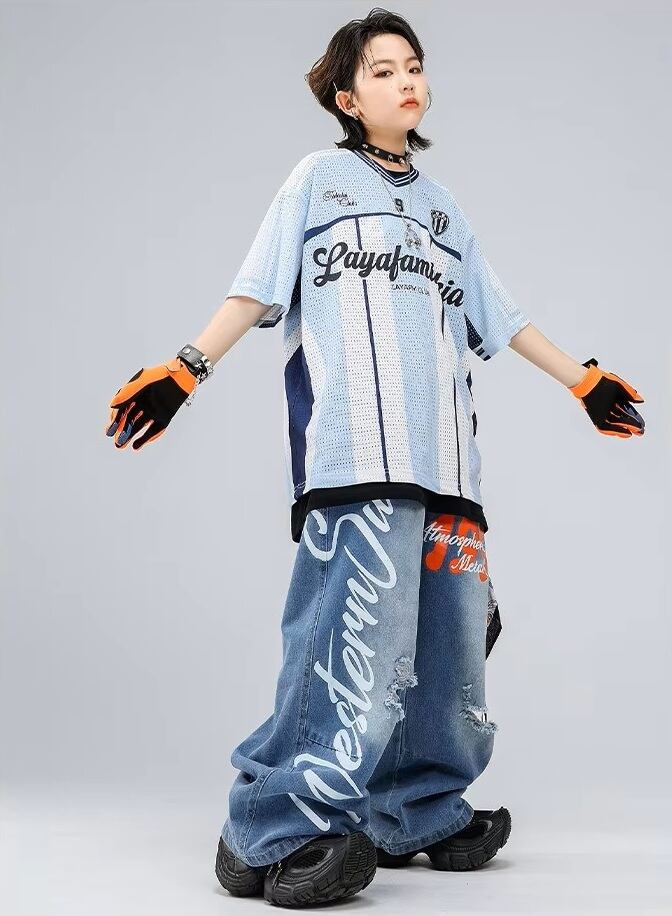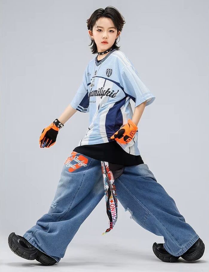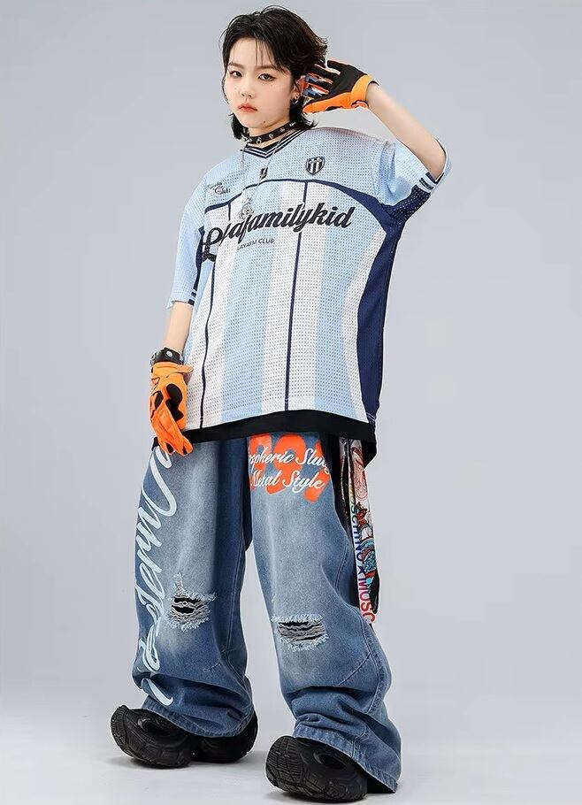 キッズ ダンス衣装 メッシュ ゲームシャツ デニムパンツ ロゴ ペイント セットアップ 韓国 ストリート ヒップホップ K-POP 青 ブルー 女の子 男の子 発表会 かっこいい KD-10