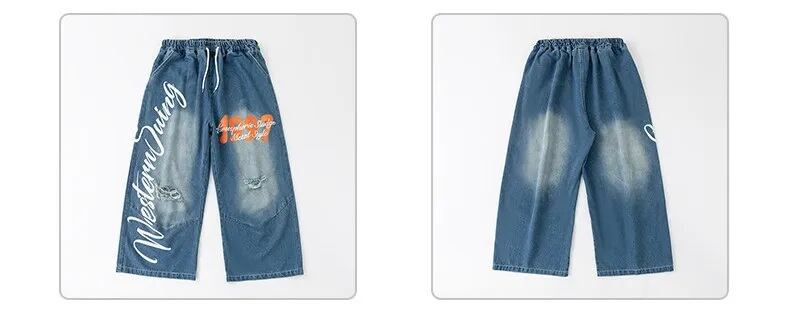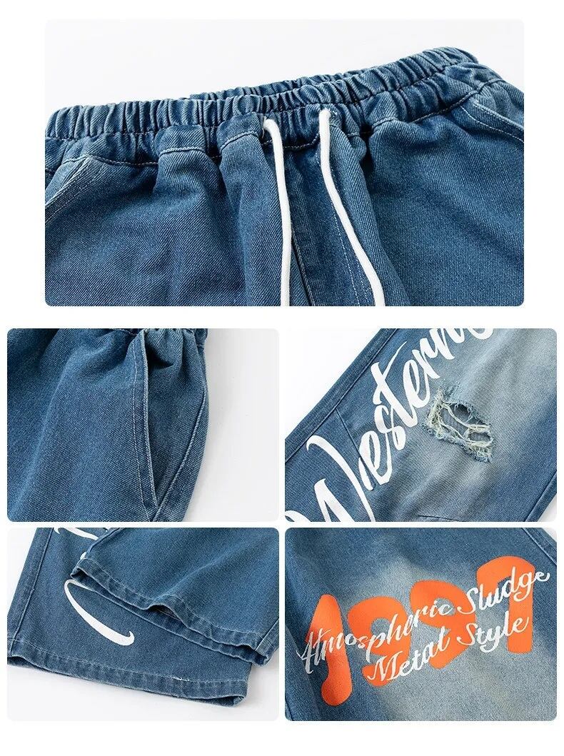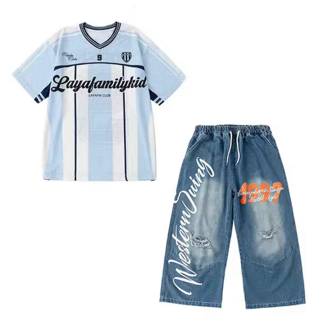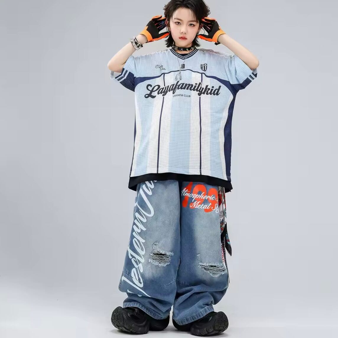 キッズ ダンス衣装 メッシュ ゲームシャツ デニムパンツ ロゴ ペイント セットアップ 韓国 ストリート ヒップホップ K-POP 青 ブルー 女の子 男の子 発表会 かっこいい KD-10