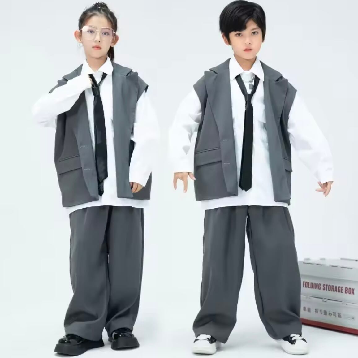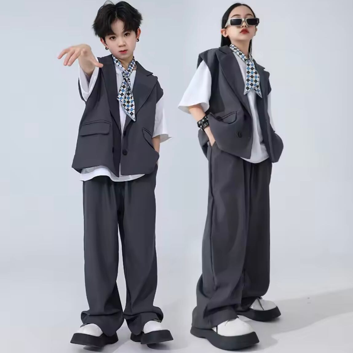 グレーのオーバーサイズベストとワイドスラックスのセットアップに、ネクタイを合わせた「大人顔負けのスーツライク」なデザイン。K-POPのダンスシーンや、ジャズヒップホップ、LOCKダンスなど、少し大人っぽい演出の発表会にもぴったりな一着です。